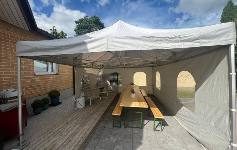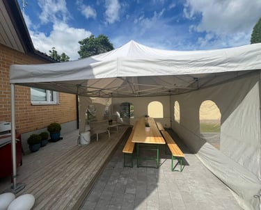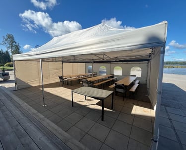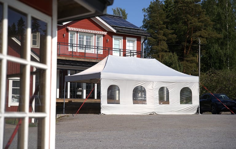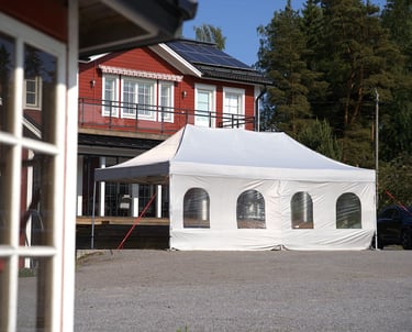 Tässä kohteessa Teltfixin juhlatelttaa käytettiin huvilan yhteydessä lisätilan luomiseksi ulos. Teltta tarjoaa katettua ja suojattua tilaa esimerkiksi ruokailuun, oleskeluun tai juhliin. Ratkaisu sopii erinomaisesti tilanteisiin, joissa tarvitaan nopeasti lisää tilaa vieraille ilman pysyviä rakenteita.