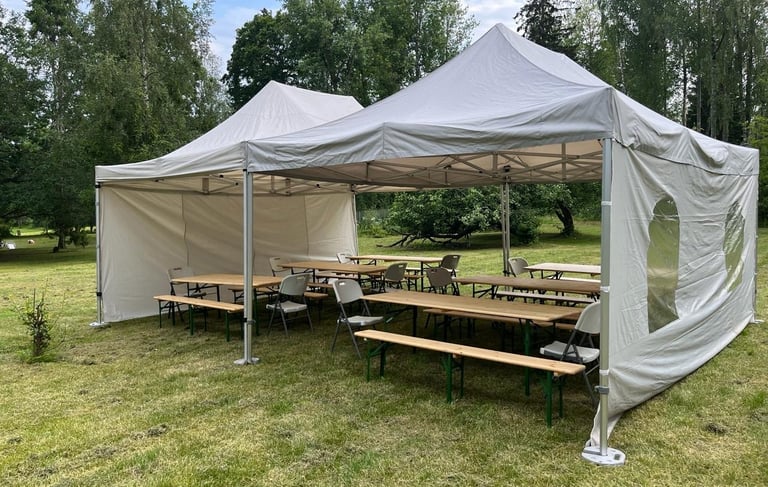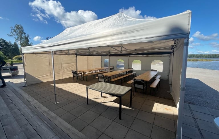 Tässä kuvassa kaksi Teltfixin 4 × 8 metrin juhlatelttaa on yhdistetty yhdeksi suuremmaksi kokonaisuudeksi ennen yritysjuhlaa. Telttojen alle järjestettiin pöydät ja istumapaikat vieraille, mikä loi tilavan ja suojaisan juhlatilan ulos. Useamman teltan yhdistäminen mahdollistaa joustavan ratkaisun suurempiin tapahtumiin, joissa tarvitaan enemmän katettua tilaa vieraille.